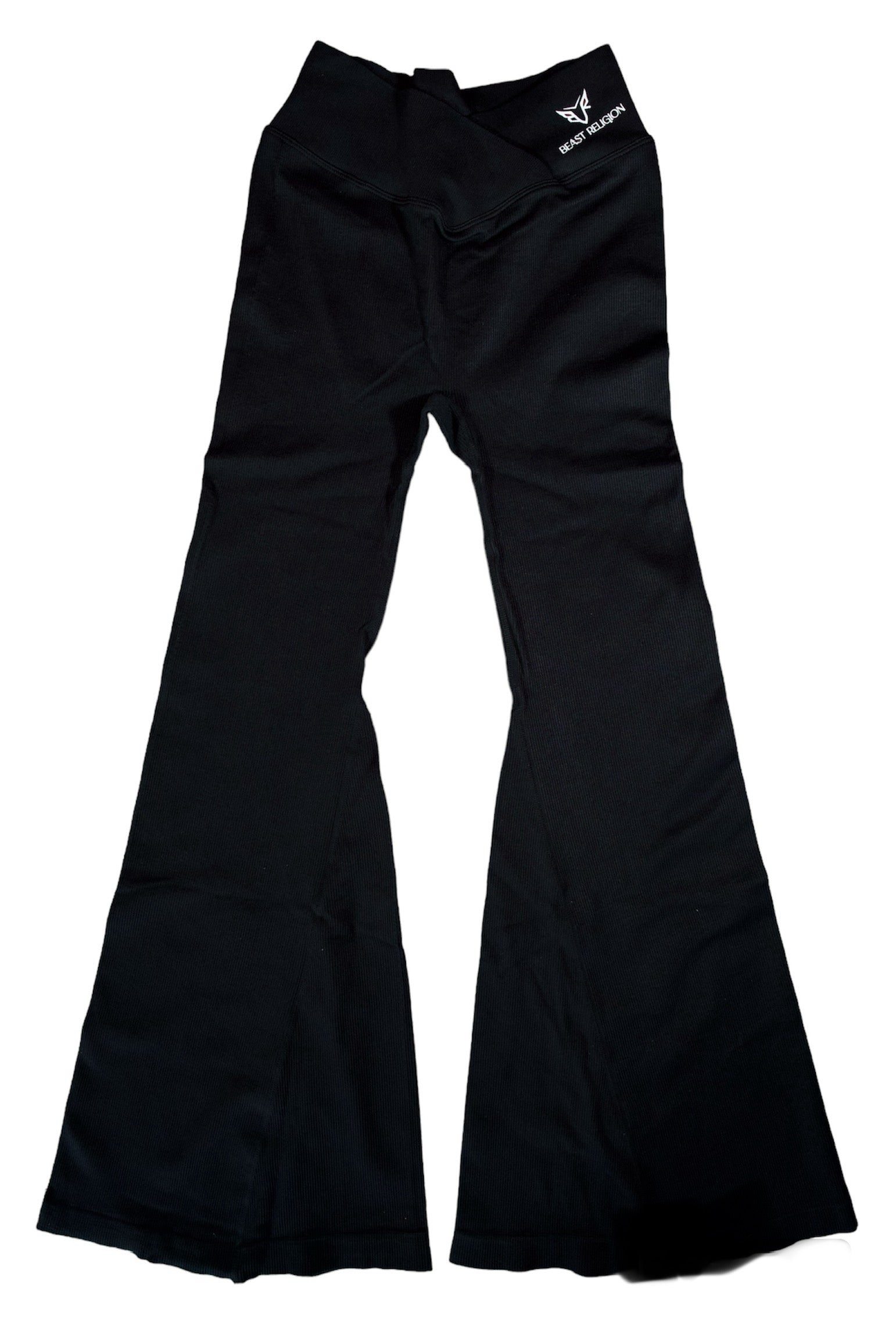 Introducing our Beast Religion V Cut Cross Flared Yoga Pants. The unique V cut cross design adds a touch of elegance and sophistication to your look, while the flared style adds a trendy flair.